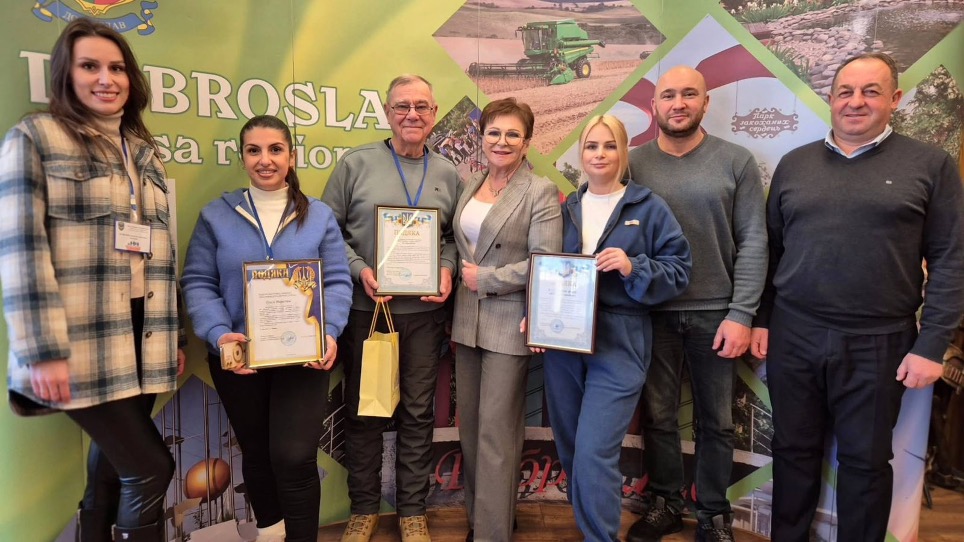 Von l nach r Anastasiia, Olga, JR, Lyudmila (Bürgermeisterin von Dobroslav), Oksana, Sasha, Assistent von Lyudmila.